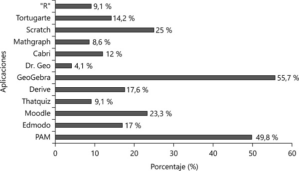 En el otro extremo, programas más específicos como R (9,1%), que requieren el dominio de destrezas tecnológicas más avanzadas para su utilización, Mathgraph (8,6%), Dr. Geo (4,1%) registran bajos porcentajes de utilización. Estos programas interactivos para la enseñanza de geometría aparecen relegados, posiblemente por el uso institucionalizado que en Uruguay tiene la aplicación GeoGebra. Este hecho se constata en iniciativas como la organización del curso semipresencial de GeoGebra dirigido a profesores de enseñanza secundaria del Uruguay con el objetivo de capacitar a los docentes en el uso del software (MACHADO et al ., 2012) y en la elaboración de un estudio, realizado por docentes del Consejo de Formación en Educación de la Anep, que recoge algunas experiencias didácticas del uso de GeoGebra para el trabajo en la escuela primaria (DAMISA; DODINO; PIEDRA CUEVA, 2017).