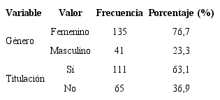 La muestra cuantitativa fue por conveniencia (HERNÁNDEZ SAMPIERI; FERNÁNDEZ COLLADO; BAPTISTA, 2010). Para el estudio descriptivo y explicativo, se conformó una muestra de profesores de Matemática de 1er Nivel de Educación Secundaria que constituyó nuestra población de estudio. Se enviaron 1.593 3 invitaciones por vía mail entre 24/8/2018 y 12/9/2018. Finalmente, la muestra voluntaria quedó integrada por 176 docentes que respondieron la invitación. La media de edad es de 42 años (< 21, > 63 y DS = 9,69), con una experiencia docente promedio de 14,8 años (< 1 y > 40 años y DS = de 8,48). El perfil sociodemográfico de la muestra puede apreciarse en la Tabla 1 .
