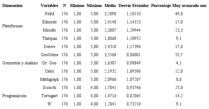 A tales efectos se seleccionaron para el análisis dos aplicaciones (GeoGebra y Scratch) y dos plataformas (PAM y Moodle) de mayor uso docente, además de los cuatro dispositivos digitales relevados.
