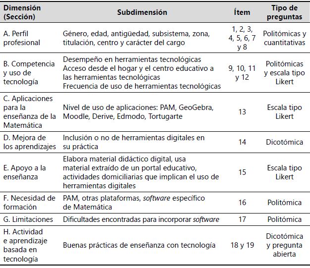 El cuestionario diseñado se estructuró en ocho secciones, aunque solamente fueron consideradas para este artículo las dimensiones referidas a las competencias tecnológicas de los docentes. En particular, se analizó la frecuencia con que los docentes utilizan dispositivos digitales con sus alumnos en el aula de Matemática. Este procedimiento se realizó mediante una escala tipo Likert (respuestas categorizadas entre extremos de “Nunca” y “Todos los días”). Además se utilizó una escala que permitió determinar el nivel de uso de aplicaciones específicas para Matemática (respuestas categorizadas entre los extremos “No competente” y “Avanzado”). En la Tabla 2 se incluyen las dimensiones y subdimensiones del cuestionario así como el tipo de preguntas realizadas.