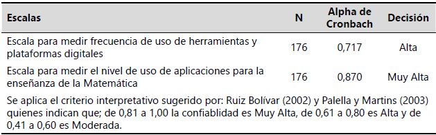 Para el proceso de validación del cuestionario, se realizaron dos procedimientos: a) prueba piloto aplicada a 8 profesores de Matemática que no integraban la muestra y b) evaluación de las propiedades métricas de las escalas utilizadas. La prueba piloto fue efectuada por la plataforma Limesurvey para poder testear las condiciones de aplicación y los procedimientos. El proceso de validación permitió identificar las dificultades en la aplicación de las preguntas y mejorar aquellos aspectos que daban lugar a confusiones. Así, la pregunta original “ ¿Planifica estrategias pedagógicas para alumnos con necesidades educativas especiales utilizando herramientas y plataformas digitales? ” fue sustituida por “¿Planifica el uso de herramientas y plataformas digitales de acuerdo a las experiencias y aprendizajes previos de sus alumnos?”.