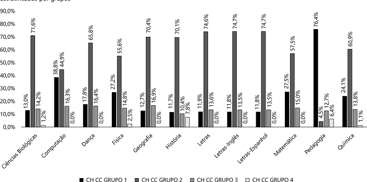 Após a análise da carga horária dos componentes curriculares obrigatórios e de suas ementas, estes foram categorizados em quatro grupos: grupo 1 - formação para docência, que se refere às didáticas e às metodologias de ensino; grupo 2 - formação técnica da área do conhecimento; grupo 3 - práticas (estágio) de ensino e grupo 4 - outros (trabalho e/ou monografia de conclusão de curso).