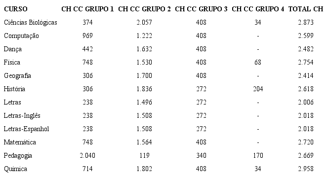 CH: carga horária; CC: componentes curriculares; Grupo 1: componentes curriculares obrigatórios que se referem às didáticas e metodologias de ensino; Grupo 2: componentes curriculares obrigatórios que se referem à formação específica da área do conhecimento; Grupo 3: componentes curriculares obrigatórios referentes às práticas (estágio) de ensino; Grupo 4: componentes curriculares obrigatórios, chamados de “outros”, tais como trabalho e/ou monografia de conclusão de curso.