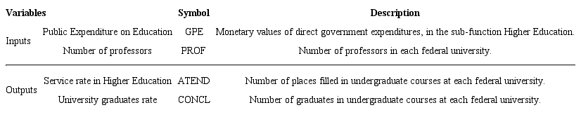 The selection of variables defined as inputs and outputs is a complex task, considering there is no standard process for defining such variables. Accordingly, the availability of information and the objectives of the research may be relevant factors in the choice of a set of variables ( KATHARAKI; KATHARAKIS, 2010 ). In face of the importance of the selection of variables, Table 1 features the variables used for application of the DEA method in this research.