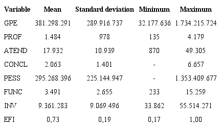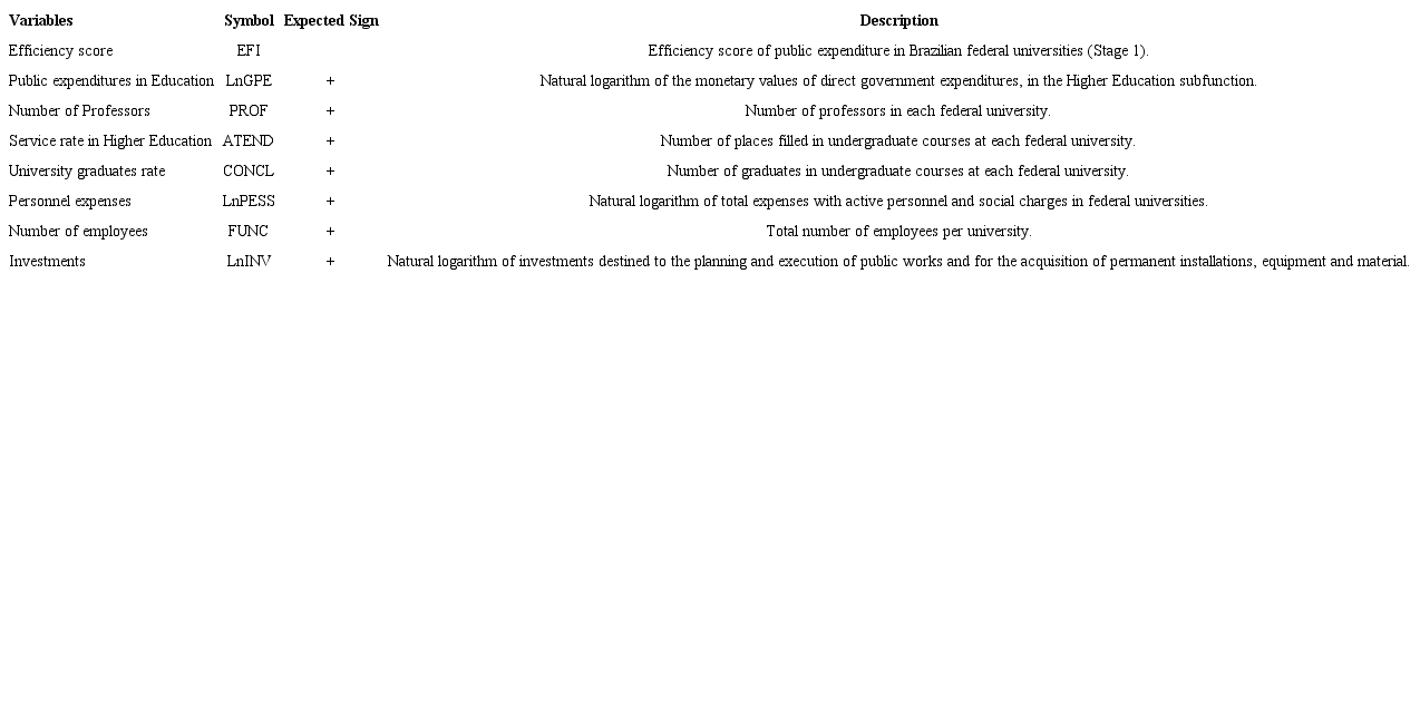For the second stage, variables LnGPE, LnPESS e LnINV were featured in natural logarithms, in order to homogenize data throughout the analyzed period. Regarding the LnPESS variable, it is believed that total personnel expenses may affect the variation of Higher Education efficiency. Cunha and Rocha (2012) have used this variable to evaluate the efficiency of public universities in Portugal. Katharaki and Katharakis (2010) have also considered this variable in evaluating efficiency, with a sample of 20 Greek universities. The importance of human resource management is highlighted, as investments in people management bring positive contributions to university performance ( KATHARAKI; KATHARAKIS, 2010 ).