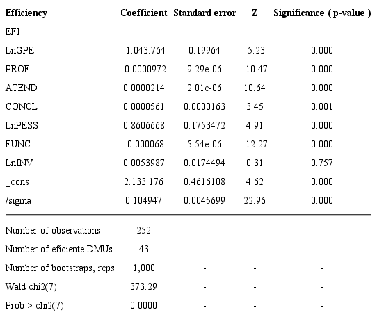 On the second stage of application of the research method, the efficiency was considered as a dependent variable in the truncated regression model. The following were used as independent variables: public expenditures with Higher Education, in other words, financial amounts for direct spending in the Higher Education subfunction; number of professors; number of enrolments; number of graduates; personnel expenses; total number of employees; financial amounts for investments in federal universities.