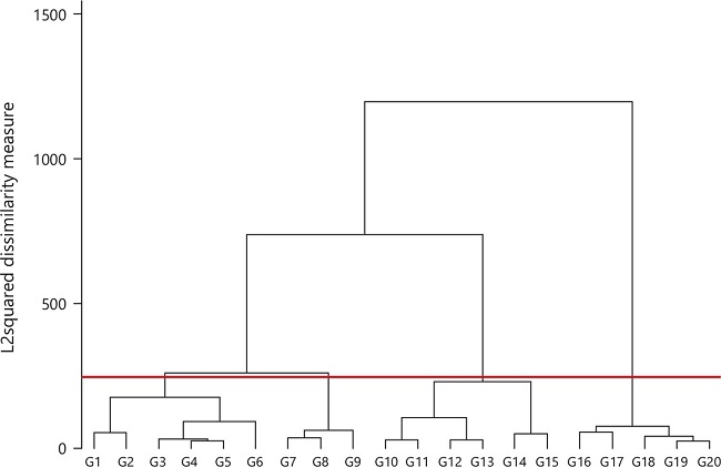 The dendrogram in Figure 1 illustrates the cluster solution obtained through the application of the hierarchical Ward method. A dendrogram is a diagram representing a tree, which shows the hierarchical relationship between clusters. Cluster analysis groups variables and aims to merge the clusters based on their homogeneity. According to the reading of the dendrogram, the structure starts forming twenty groups (G1-G20), and then it keeps diminishing the number of clusters by grouping the assessment instruments according to their characteristics. The final purpose is to reach a point where the number of clusters contains a similar number of instruments to analyze them in a more limited and simpler way. All what is joined together in the dendrogram below the horizontal red line are the clusters. In this case, the dendrogram indicates that four clusters are the most convenient solution.