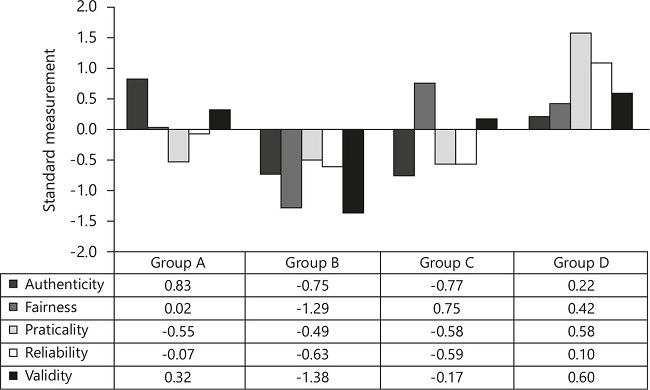 Figure 2 explains in detail the four clusters formed and their scores in the light of the language assessment principles. Each group is represented in Figure 2 with its scores separately to illustrate the differences. It is easy to identify which groups have the highest scores in each language assessment principle. For instance, Group A has the highest score in Authenticity, Group C has the highest score in Fairness, and Group D has the highest score in Practicality, Reliability and Validity. At the same time, it is easy to identify the lowest scores in each language assessment principle. Group C has the lowest score in Authenticity and Practicality, Group B has the lowest score in Fairness, Reliability and Validity.