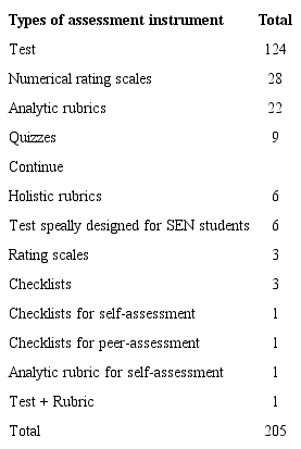Out of the 205 assessment instruments, 12 different types were identified. The most common type was tests (60%). This result was predictable as in Chile the most used assessment instruments are tests. Coombe (2018) described tests as practical since they help teachers to assess and in most of the cases, grade students’ performance and give valuable feedback to learners. Tests are an important part of the Chilean educational assessment policy because of their versatility and easiness when creating and grading them.