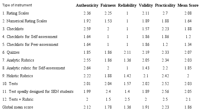 As for the types of instruments, Rating scales have the highest score in terms of Practicality (2.70) and their lowest score is in Reliability (1.00). The Numerical rating scales have the highest score in Authenticity (1.92) and their lowest score in Reliability (1.00). Regarding Checklists, the highest score is in Authenticity (2.59) and their lowest score is in Reliability (1.00). Checklists for self-assessment have a relatively high score in both Validity and Practicality (1.86), and their lowest score is in both Fairness and Reliability (1.00). Checklists for peer-assessment have a high score in Validity (1.86) and their lowest score is in both Fairness and Reliability (1.00). Quizzes have their highest score in Practicality (2.33) and their lowest score in Authenticity (1.85). Analytic rubrics have their highest score in Authenticity (2.55) and their lowest score in Reliability (1.36). Analytic rubrics for self-assessment have their highest score in Authenticity (2.64) and their lowest score is in Reliability (1.00). Holistic Rubrics have the highest score in Practicality (2.22) and their lowest score in Reliability (1.42). Tests have a high score in Practicality (2.52) in contrast to Reliability, which has the lowest score (1.57). Tests specially designed for students with special needs have their highest score in Practicality (2.56) and their lowest score in Reliability (1.40). Finally, Tests + rubric have the highest score in Reliability and Practicality (2.50), and the lowest score in Fairness (1.50) (See Table 2).