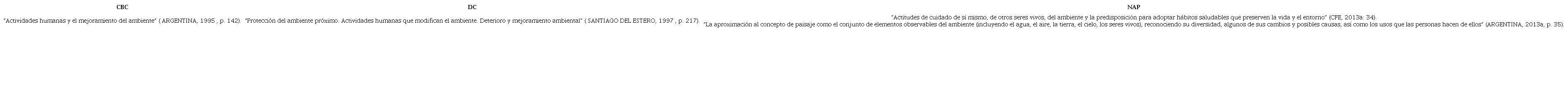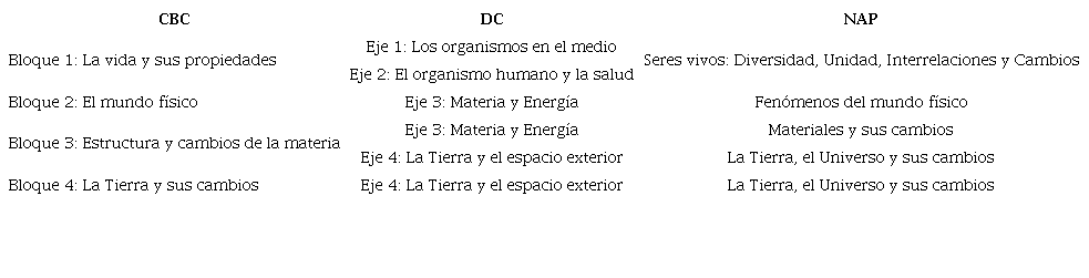 Los contenidos conceptuales de los CBC están presentados en cuatro bloques ( ARGENTINA, 1995 ), en el DC de la provincia de Santiago del Estero se dividen en cuatro ejes (SANTIAGO DEL ESTERO, 1997), mientras que en los NAP están organizados en cuatro núcleos temáticos (ARGENTINA, 2013a, 2013b). En la Tabla 1 presentamos la correspondencia de los agrupamientos de los contenidos mencionados en los 3 documentos. Los contenidos de los CBC son reproducidos en el DC, adecuándose a la normativa que indicaba que los DC jurisdiccionales debían abarcar los contenidos de los CBC, pudiendo incluir otros, relevantes a nivel local y provincial. La Tabla 1 evidencia una continuidad en los contenidos conceptuales presentes en los documentos analizados.