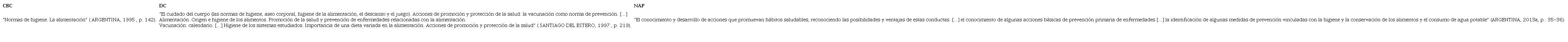 En todos los casos hay una referencia a la higiene y la alimentación. No hay una recuperación de la memoria histórica ni de las prácticas culturales en torno a la alimentación; tampoco, sobre cómo se entiende a la salud en distintos espacios sociales. De esta manera, la diversidad sociocultural presente en las aulas y constitutiva del país, se encuentra ausente en estos documentos, lo que ha sido en el pasado una forma de violencia simbólica en pos de la homogeneización cultural ( DIKER, 2008 ). Los dos últimos (DC y NAP), además, se enfocan en la prevención de enfermedades, sea a partir de la higiene, vacunación, etc., cuando son de origen contagioso, o de hábitos de conducta cuando no lo son (como la alimentación). En el DCJyA hay una mención en las expectativas de logro, centrada en hábitos y prácticas, en este caso reconociendo dimensiones sociales de la salud: “Desarrollar hábitos que beneficien la salud tanto en su dimensión individual como social, adoptando una actitud crítica frente a las prácticas que tienen efectos negativos para la misma” ( SANTIAGO DEL ESTERO, 2004 , p. 96).