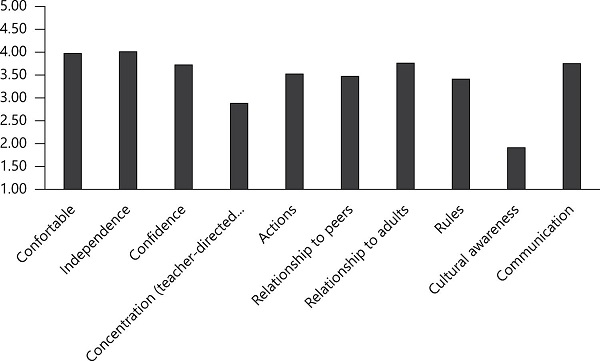 The first analyses carried out show a description of the behavioral scales and PSED, based on the mean scores (on a scale from zero to 5). All 678 cases were included at this time. Graph 1 shows how children, overall, scored on the 10 items that make up the PSED scale.