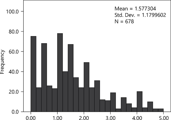 Graphs 2 and 3 show the distribution of the values as assigned to the children by the teachers concerning the dimensions of inattention and hyperactivity/impulsivity, respectively. The data suggests that most children obtained scores between zero and 2, which corresponds to the answers of “never” and “sometimes” for these behaviors. However, there was a significant number of children who were classified as 4 or 5, indicating that they “always” or “almost always” showed characteristics of inattentive behavior.