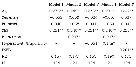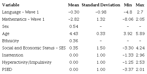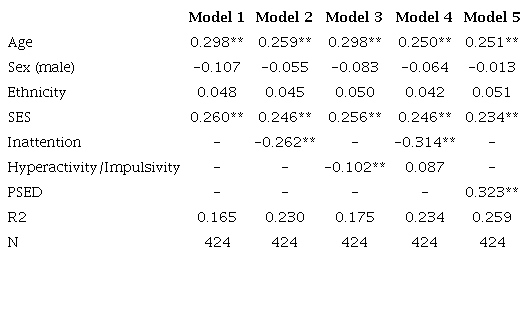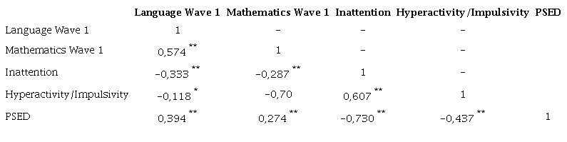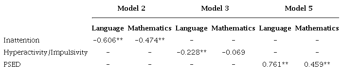Table 2 shows the correlations between behavior indicators and PSED, and the dependent variables within the multivariate regression model. The data suggest a negative correlation between the indicators of inattention and hyperactivity/impulsivity and the development of the child in language and mathematics. The more inattentive or hyperactive/impulsive the child, the lower their development in the two above-mentioned dimensions, which corroborates the literature on the subject ( MERRELL; TYMMS, 2001 ; TYMMS et al. , 2017; TYMMS; MERRELL, 2006 ).