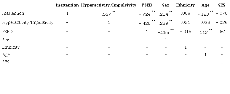Table 3 shows the correlation between the behavior indicators and those of PSED, and the model’s control variables. The results show that the variables of ethnicity and SES had non-significant correlations with the three indicators. The variable of “sex” as significant for all indicators, being weak, yet positive for inattention and hyperactivity/impulsivity and negative for PSED. The bivariate correlations suggest that, on average, boys tended to be more inattentive and had less social and emotional development, compared to girls.