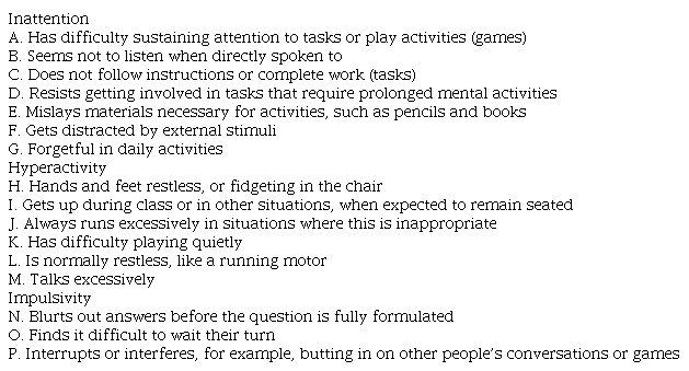 The DSM-IV divides ADHD into three subtypes: (i) predominantly inattentive; (ii) predominantly hyperactive/impulsive; and (iii) a combination of the two. For a clinical diagnosis to be made, it is necessary to meet various criteria, such as the prevalence of the behavior patterns over the last six months.