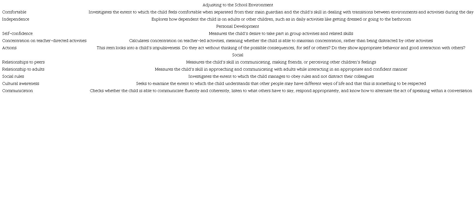 The second scale, known as PSED, had 11 items originally, while the Brazilian version (translated as DPSE) had only 10 items. This scale can be divided into three subscales: “adjusting to the school environment,” “personal development,” and “social development.” The combination of some of these items could suggest development impairment and even difficulties with social coexistence. The Chart 2 shows the items and their descriptors.