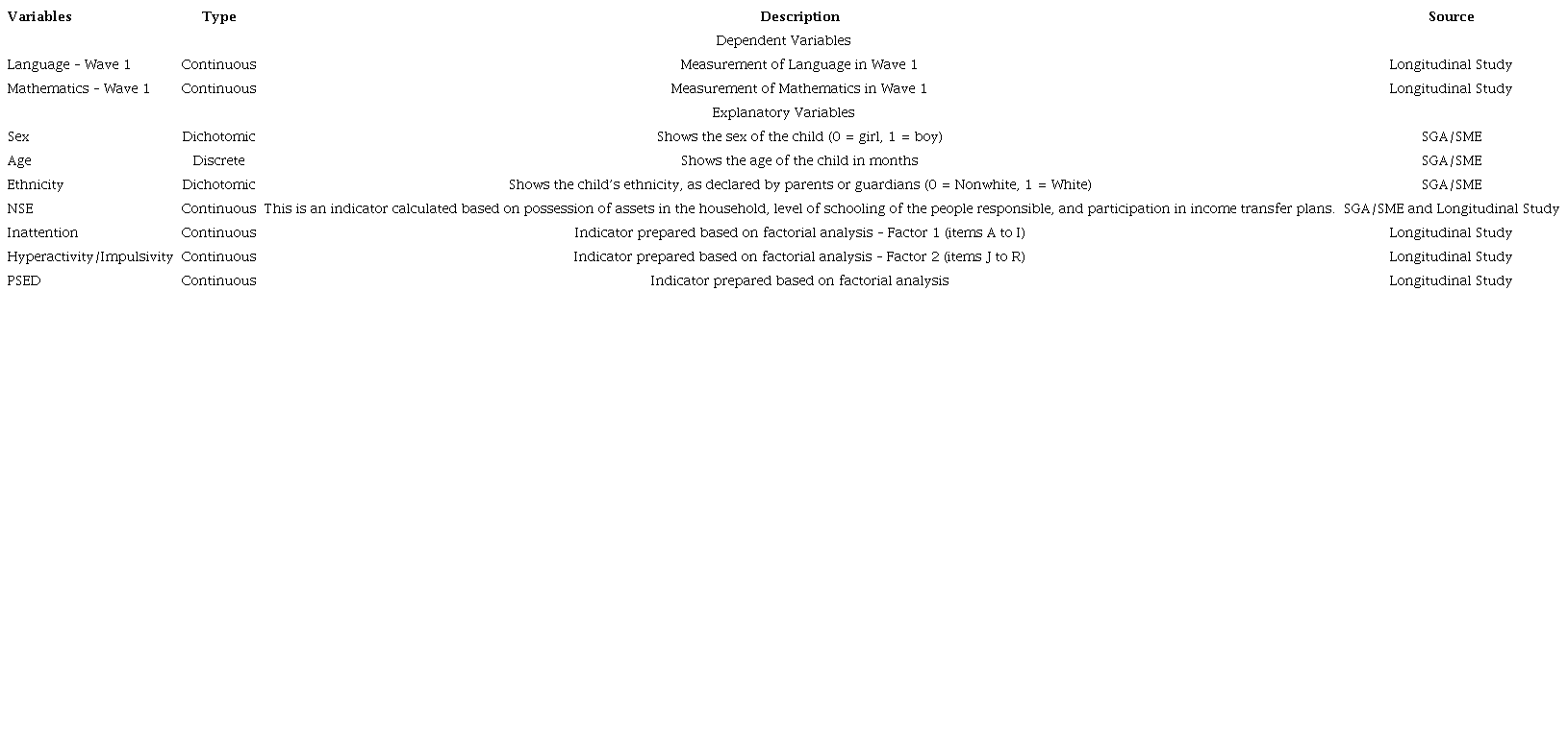 The present study only used data from the first wave of data collected between March and April 2017. It used models based on multivariate regression to identify factors associated with the cognitive development of children when they start pre-school. The explanatory model has three main dimensions: a) the age of the child at the time of data collection; b) social and economic characteristics of the families; and c) indicators of behavior and PSED.
