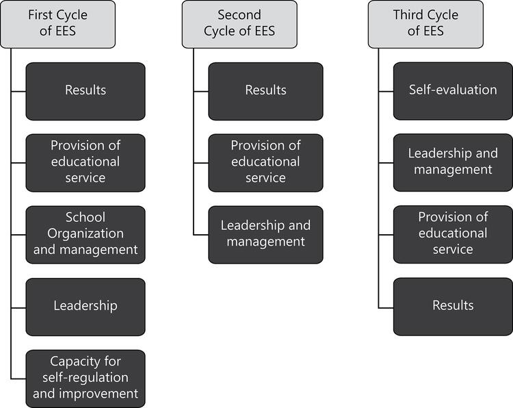 The frame of reference for the third cycle of EES presents unique features compared to the previous two concerning the domains and indicators of evaluation, where self-evaluation assumes a central role. This cycle of EES is also unique because it includes other types of schools (such as professional and artistic schools, private and cooperative institutions, in addition to the public schools that have been the subject of the two previous cycles). Its methodology has changed to include observation of teaching practice, visits to schools by the EES teams are now longer, and EES teams now include four elements – two from the General Inspectorate of Education, and two external elements, usually from academia, instead of only three as in the previous cycles of evaluation. This contributes to greater appreciation of the procedural and practical aspects, particularly curriculum and pedagogy, which have gained importance in the third cycle of EES (FIALHO et al ., 2020; HOLLOWAY, 2020 ).