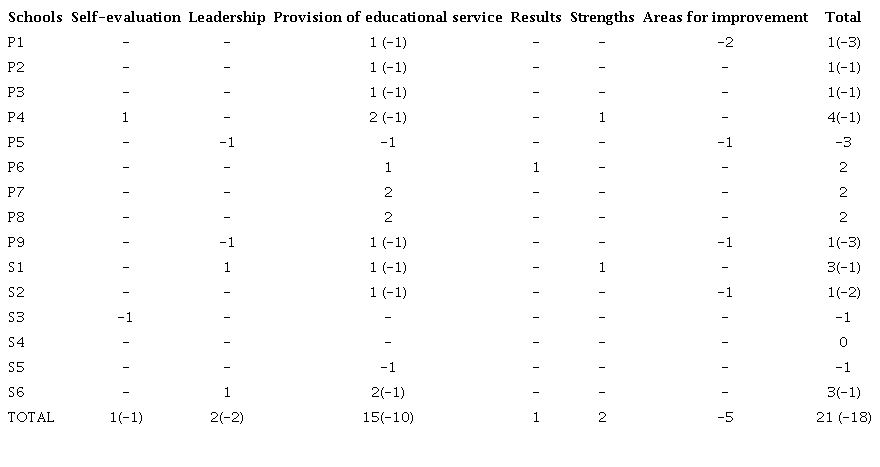 In this analysis, we used the sections included in the reports (the four assessment domains and the strengths and areas for improvement) as organizing categories. We quantified the positive and negative references to the notion of teacher collaboration. These results are presented in Table 1 .