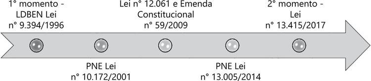 Para esta finalidade, foi constituído um recorte temporal, almejando estabelecer conexões com leis que configuram o design do marco normativo do ensino médio no Brasil contemporâneo. Por esta razão, utilizou-se na linha temporal a Lei de Diretrizes e Bases da Educação Nacional - LDBEN, Lei nº 9.394/96 (BRASIL, 1996), o Plano Nacional de Educação PNE-2001-2010, Lei nº 10.172/01 ( BRASIL, 2001 ), a Lei de Universalização do Ensino Médio, Lei nº 12.061/09 ( BRASIL, 2009 ), o Plano Nacional de Educação - PNE 2014-2024, Lei nº 13.005/14 ( BRASIL, 2014 ) e a Lei da Reforma do Ensino Médio de 2018, Lei nº 13.415/17 ( BRASIL, 2017 ).