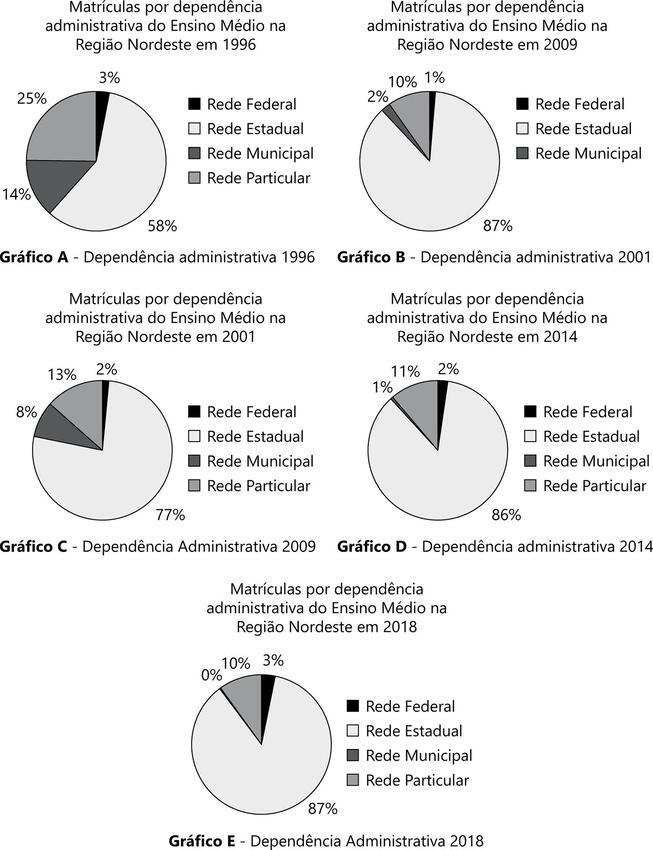 No Gráfico C, a região Nordeste passa a vivenciar uma nova fase, tanto nas políticas públicas de educação voltadas ao ensino fundamental, como no ensino médio. A primeira passa a vivenciar a fase da igualdade de tratamento; enquanto a segunda, um hibridismo entre as fases igualdade de acesso e igualdade de tratamento. Neste contexto, ocorreu expressivo crescimento das matrículas da rede estadual, alcançando o patamar de 87% das matrículas absolutas. Ao mesmo tempo, se acentua uma redução abrupta das matrículas na rede municipal, consolidando as políticas públicas de educação no tocante ao fenômeno da federalização e descentralização. As Instituições Federais passam por um decrescimento em virtude da reorganização da rede federal de educação profissional. Já a rede privada continua em declínio na composição das matrículas absolutas.