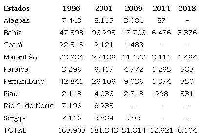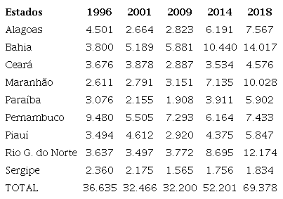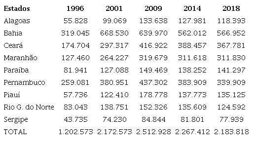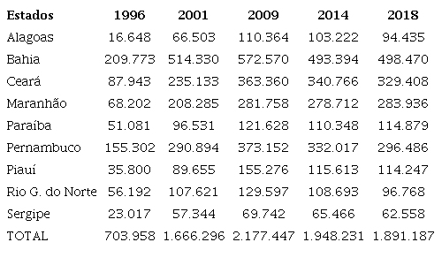 Na tabela a seguir, é possível montar um panorama das matrículas para o ensino médio na região Nordeste, tomando como referência suas unidades federativas entre os anos de 1996 e 2018.