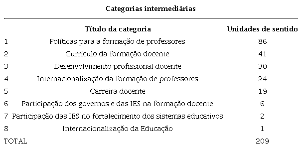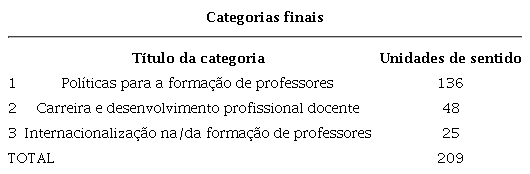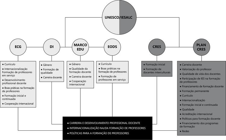 O texto encontra-se dividido em duas partes, além das considerações iniciais e finais. Na primeira, detalha-se a metodologia; na segunda, são inventariados os resultados e as inferências acerca da problematização proposta, dividida em três categorias analíticas: políticas para a formação de professores; carreira e desenvolvimento profissional docente e internacionalização na/da formação de professores.
