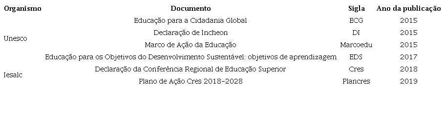 Para isso, considerou-se a natureza do organismo internacional, o contexto, o conteúdo e os discursos presentes nos documentos, que são os orientadores das políticas nacionais para a formação de professores nos países membros da ONU. Assim, para essa investigação, foram utilizados os documentos oriundos de organismos internacionais/multilaterais datados de 2015/2019, conforme o Quadro 1 .