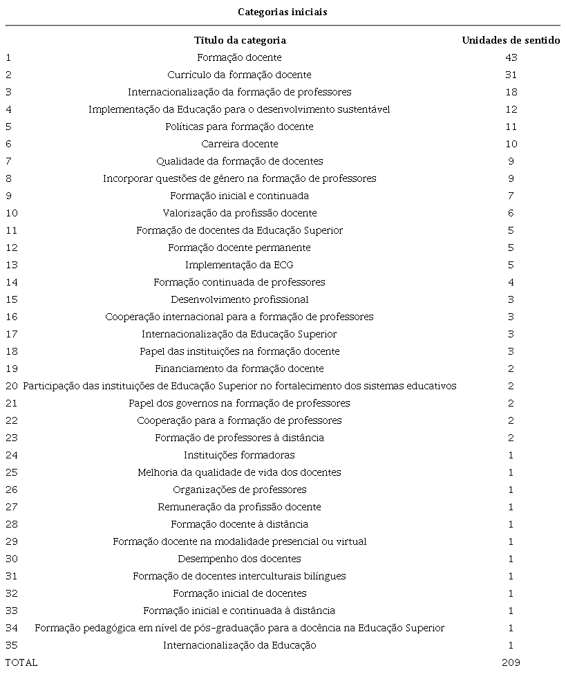 Buscou-se realizar uma análise crítica dos documentos, para que fosse possível extrair enunciados significativos desse conjunto de textos. Ao considerar as indicações constantes no levantamento realizado, o processo de unitarização 2 resultou em 209 unidades de sentido, as quais foram organizadas em 35 categorias iniciais, apresentadas em títulos e distribuição quantitativa de unidades de sentido, conforme disposto na Tabela 1 .