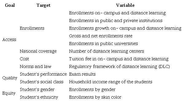 The expansion of HE in Brazil started with the PNE between 2001 and 2011 with the idea that knowledge is the basis of scientific and technological development capable of current dynamizing societies ( AGUIAR, 2010 ). In 2014, Brazil renewed such principles for the PNE (2014-2024), encouraging the use of DLHE. The primary outcome of such plans concerning primary goals on DLHE is displayed as follows.