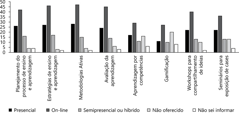 Convém destacar que, ao contatar as universidades para participar da pesquisa, algumas mencionaram que não existem ações centralizadas de formação docente, mas várias iniciativas provenientes de setores diferentes da instituição, o que pode justificar a existência de muitos cursos de formação cuja participação é voluntária.