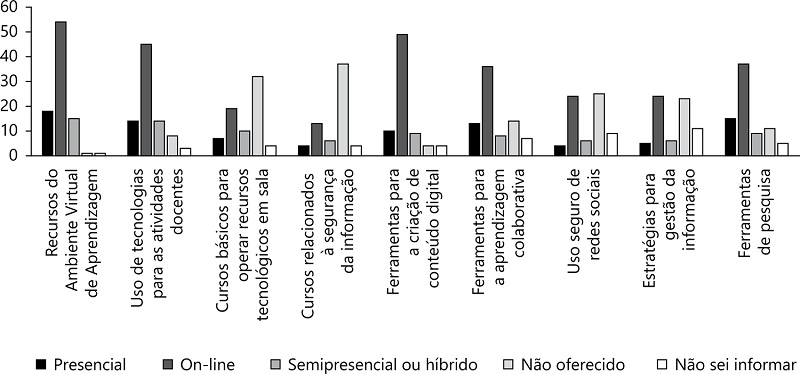 Da mesma forma que ocorre com os outros cursos já apresentados, a modalidade on-line se sobressai. O curso mais ofertado é sobre os Recursos do AVA. Na sequência, destacam-se os cursos sobre o uso de Ferramentas para a criação de conteúdo digital (vídeo, áudio etc.) e uso de Tecnologias para as atividades docentes (como Kahoot, Jamboard, Trello etc.). Entretanto, verifica-se que há cursos que são pouco ofertados, como aqueles relacionados à segurança da informação (detecção de vírus, malware, fake news ), cursos básicos para operar recursos tecnológicos em sala de aula (computador pessoal, notebook, datashow ), uso seguro de redes sociais e estratégias de gestão da informação. Observa-se que os cursos mais ofertados têm relação com uma maior demanda que surgiu com a adoção do Ensino remoto emergencial. Eles foram necessários para suprir uma carência momentânea e possibilitar a continuidade das aulas.