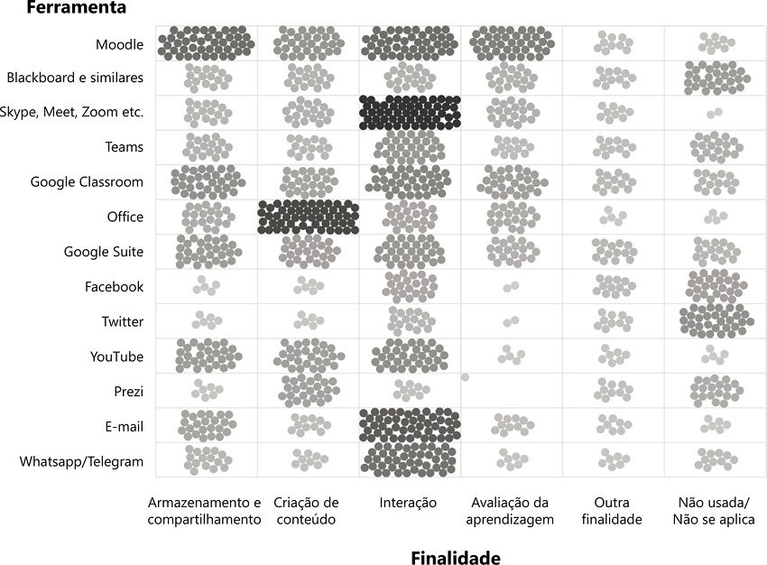 Sobre as ferramentas tecnológicas utilizadas na formação de professores, no Gráfico 3 é possível identificar a quantidade de universidades que as utilizam, bem como a respectiva finalidade de uso de cada uma delas. As finalidades de uso foram elaboradas com base em uma taxonomia resumida das tecnologias. Essa taxonomia auxilia gestores e professores a conhecer e selecionar as tecnologias disponíveis, para que façam um uso mais consciente e específico, de acordo com a estratégia didática planejada (ZEDNIK et al ., 2014). Cada ponto no gráfico representa uma universidade.