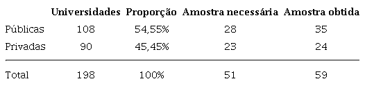 Os participantes da pesquisa são universidades brasileiras que, segundo o Censo da Educação Superior de 2019 são 198 ( INEP, 2020b ), sendo 108 públicas e 90 privadas. Como as variáveis utilizadas são qualitativas de um população finita, a Tabela 1 , a seguir, apresenta a quantidade necessária de amostras para um nível de confiança de 90% e erro inferencial de 10% ( BRUNI, 2013 ).