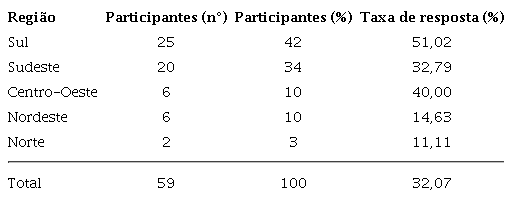 Na sequência serão apresentados os resultados obtidos. Com relação a distribuição regional das universidades participantes da pesquisa e as respectivas taxas de retorno das respostas, os números podem ser visualizados na Tabela 2 .