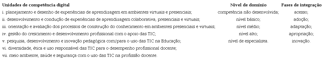 Tejada Fernández e Pozos Pérez (2018) apresentam um modelo para integração da competência digital no desenvolvimento profissional docente ( POZOS PÉREZ, 2010 , 2015 ), que possui três dimensões: unidades de competência digital, nível de domínio ou grau de complexidade e fases de integração da competência digital. A composição das três dimensões está detalhada no Quadro 1 .