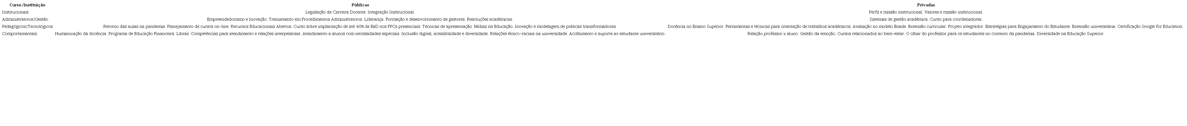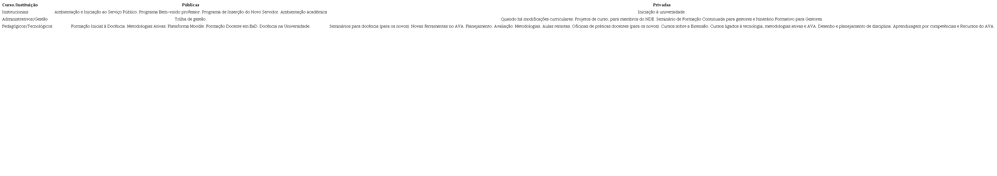 Observa-se que nas universidades públicas há uma predominância de cursos obrigatórios relacionados ao funcionamento da instituição, enquanto nas universidades privadas predominam cursos relacionados às práticas pedagógicas/tecnológicas.