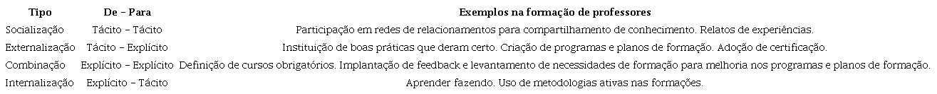 Diante das discussões apresentadas, sugere-se a adoção da Gestão do Conhecimento, mais especificamente do modelo Seci, para sistematizar os planos e programas de formação, pois tal modelo permite determinar ações para a conversão entre os tipos de conhecimento existentes na instituição. De forma exemplificativa, o Quadro 4 apresenta a atuação do modelo Seci na formação de professores.