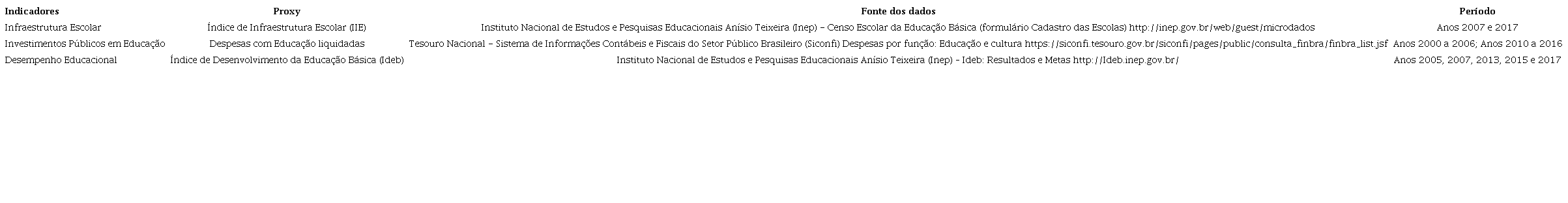 As questões centrais do estudo envolveram indicadores relacionados à infraestrutura escolar, despesas com Educação e desempenho educacional. Esses indicadores foram representados por proxies que demandaram a definição de métricas. No Quadro 1 , constam a fonte dos dados utilizados na operacionalização de cada indicador/ proxy e os anos considerados.