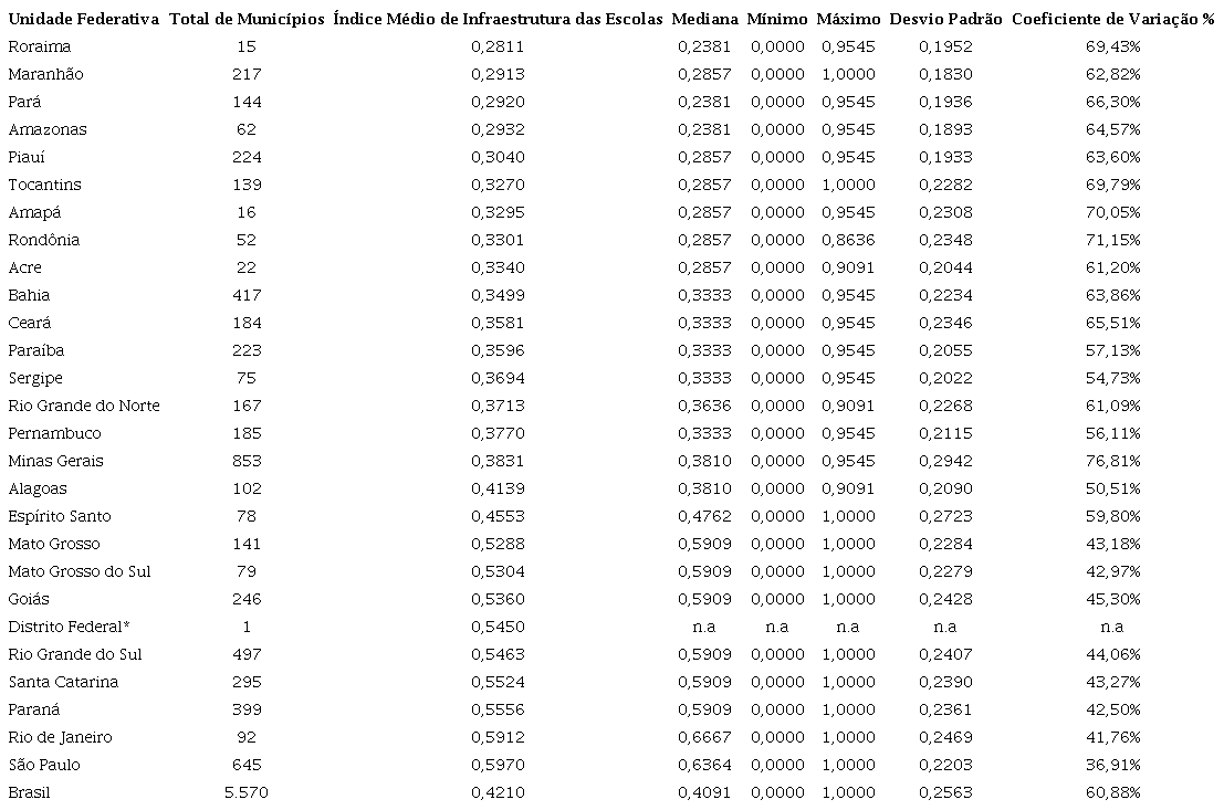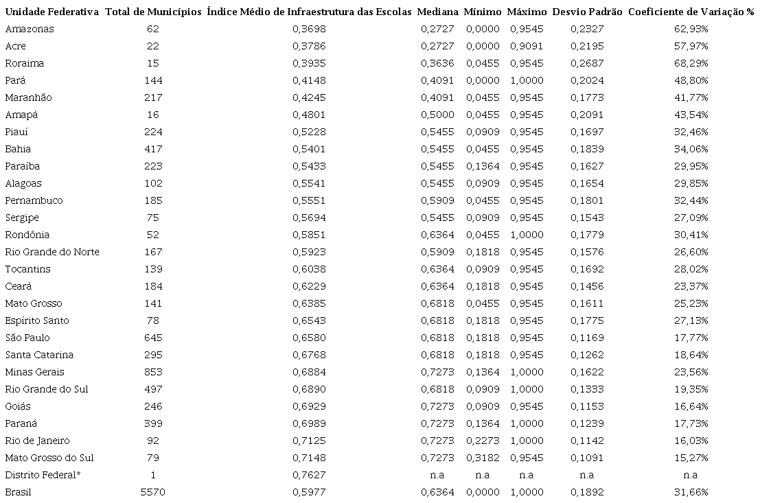 Como se observa na Tabela 1 , em 2007 menos da metade dos 22 itens avaliados estavam presentes nas escolas públicas brasileiras (IIE = 0,421 ou 42,1%). Observa-se uma heterogeneidade alta entre os municípios brasileiros (C.V > 30%), nota-se que há casos extremos dentro de cada unidade federativa, como no caso de Espírito Santo, Goiás e Maranhão, que apresentaram municípios sem qualquer infraestrutura (Mínimo = 0,00) e municípios com todas elas (Máximo = 1,00). Esse dado demonstra que o Brasil ainda se encontrava distante, não somente da equidade entre as escolas, mas também da garantia de um padrão mínimo de qualidade. Havia um percentual alto de escolas sem requisitos básicos de infraestrutura, como sala de diretoria, sala de professor e biblioteca.