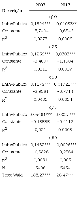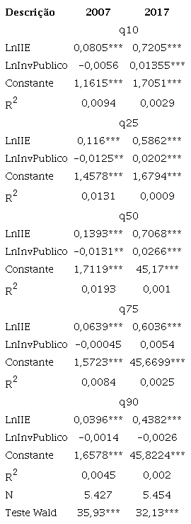 Trazendo a discussão para a importância dos investimentos públicos para a melhoria da infraestrutura escolar, os resultados expostos na Tabela 3 mostram que houve uma redução no impacto dos investimentos sobre o IIE em todos os quantis, se comparados os anos 2007 e 2017. Contudo, os coeficientes significativos reforçam que não se pode prescindir de tais investimentos se a pretensão é tornar as escolas mais adequadas a atender aos padrões requeridos quanto à infraestrutura, mesmo considerando que os coeficientes estimados mostraram uma baixa elasticidade, evidenciando que são necessários aumentos significativos nos investimentos públicos para se obter um impacto mais notório na infraestrutura escolar, assim como destacado por Sena (2014) .