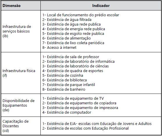 Os indicadores de cada dimensão são apresentados no Quadro 2 . Os critérios adotados na seleção foram a capacidade de refletir as condições da escola, disponibilidade espacial (para todos os municípios brasileiros) e temporal (anos de interesse do estudo: 2007 e 2017). Outros critérios desejáveis a indicadores também foram considerados, dentre eles, confiabilidade das fontes e facilidade de interpretação (RIGBY et al ., 2001).