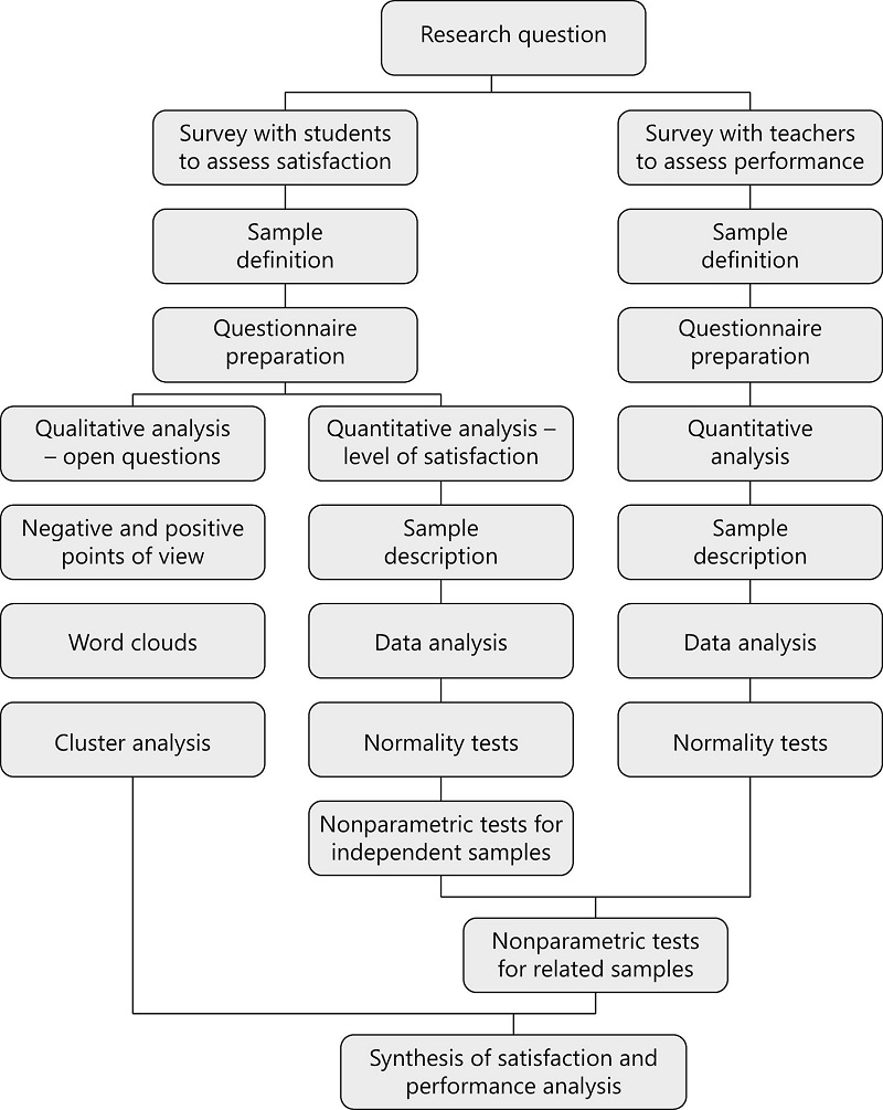 The answers were submitted to quantitative and qualitative analysis to achieve a combined interpretation of the results. In the quantitative analysis, Kolmogorov-Smirnov normality test, nonparametric tests for independent samples (Kruskal-Wallis) and related samples (Friedman test) were applied.
