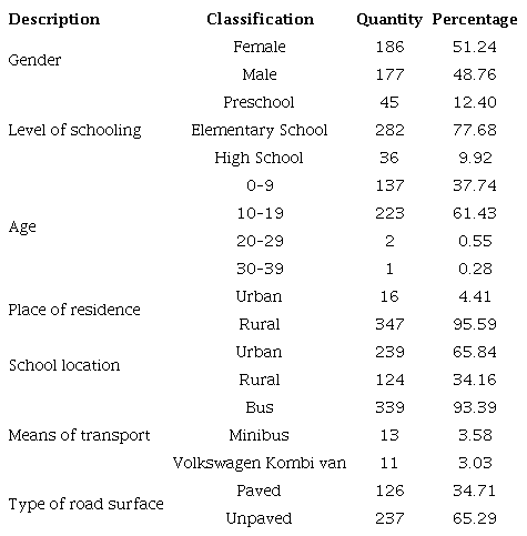 In the sample, there is a subtle female predominance (51.24%). Regarding the Education level, the majority of students attend elementary school (77.68%), since it is where most classes are. Most respondents are aged from 10 to 19 years (61.43%), followed by those aged 0 to 9 (37.74%), representing together more than 99% of the interviewees. The vast majority of interviewees live in rural areas (95.59%), although most of them attend schools located at nearby urban centers (65.84%). Regarding means of transportation, buses are the most used (93.39%). Finally, the roads taken in the students’ commute to school are mostly unpaved (65.29%).