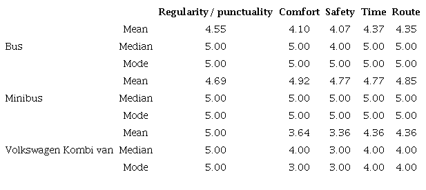 Regarding means of transportation, some criteria have presented statistically different results. The criteria regularity/punctuality (significance = 0.068), time (significance = 0.283) and route (significance = 0.172) demonstrate the same evaluation among the means of transport available. Thus, the means of transport does not interfere in the evaluation of regularity/punctuality, commute time, nor the route used. The results for comfort (significance = 0.005) and safety (significance = 0.002) are not distributed in the same way. In other words, more compact vehicles like Volkswagen Kombi Vans in terms of comfort and safety present a lower evaluation level, as demonstrated in Table 2 .