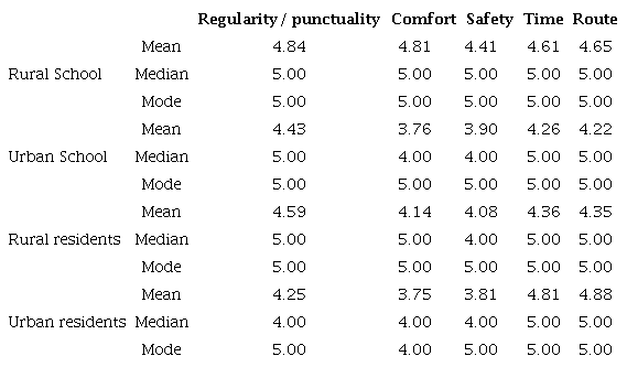 As for the place of residence, the only criterion that interferes in the assessments is route quality (significance = 0.035). In contrast, the other criteria show the same distribution, with significance over 5%. That is, the evaluations of regularity/punctuality, comfort, safety and time are independent from the site of residence. Table 3 shows that, despite the same medians and modes in most criteria, the mean for the route differs.