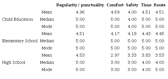 The evaluation of school dropout presents the same mode and median of regularity/punctuality, as well as a similar means. In the evaluation of school performance, the mean is also close to the obtained in the criterion regularity/punctuality revealed by students. From this test, it is possible to infer that students satisfied with the transport system may attend school more regularly and punctually, with a tendency to lower school dropout and better performance, as highlighted by Caiado and Gonçalves (2014) and Martins (2010) .