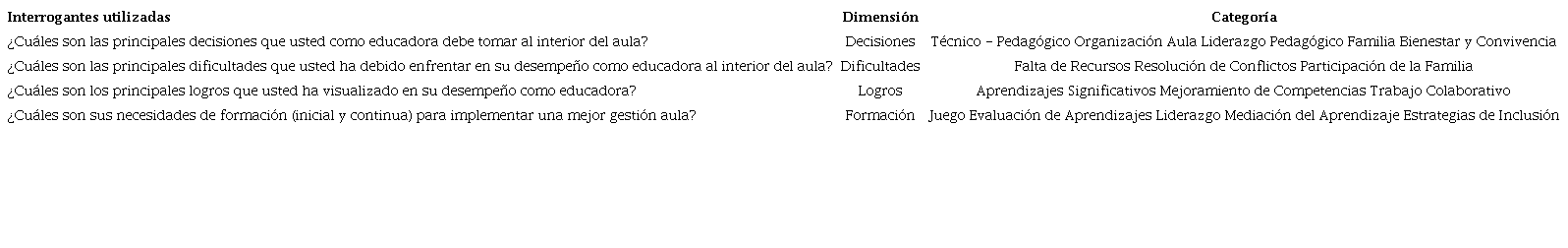 Las participantes firmaron un consentimiento informado. La entrevista fue presencial y audio grabadas (entre 50/70 minutos), transcribiéndose para el análisis de contenido bajo la técnica descrita por Bardín (2010). Los procedimientos para procesar los datos: (a) primero, la información transcrita se leyó exhaustivamente, buscando ideas principales por cada interrogante establecida, codificada mediante NVIVO 10.0. Cuando los datos brutos del texto se transformaron en una representación del contenido, obteniendo la selección de los mensajes transcritos, se utilizaron tres técnicas: recorte, enumeración y clasificación, y agregación; (b) segundo, del abanico de códigos obtenidos se levantaron categorías analíticas que obedecieron a dimensiones emergentes. El procedimiento se hizo en dos etapas -inventario y clasificación- permitiendo la definición de dieciséis categorías empleadas para la de los datos. Desde tales categorías, y como último paso, se construyó el análisis de contenido, el cual implica el tratamiento de resultados, es decir, la selección de respuestas más representativas de las categorías de análisis, permitiendo acercarse a las respuestas de las interrogantes. El Cuadro 1 contiene las interrogantes junto a las dimensiones y categorías resultantes.